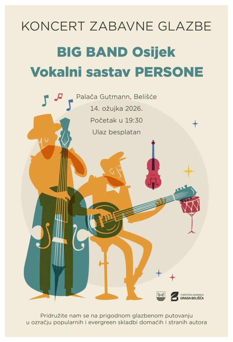 Turistička zajednica Grada Belišća poziva sve građane na koncert zabavne glazbe koji će se održati u subotu, 14. ožujka s početkom u 19 sati i 30 minuta u predivnom ambijentu Palače Gutmann u Belišću.