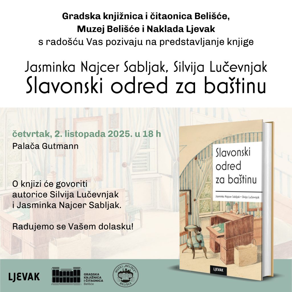 Belišćanskoj publici knjigu će predstaviti same autorice dr. sc. Jasminka Najcer Sabljak, profesorica na Akademiji za umjetnost i kulturu u Osijeku, i Silvija Lučevnjak, ravnateljica Zavičajnog muzeja Našice. „Slavonski odred za baštinu“ rezultat je njihovog višegodišnjeg terenskog i arhivskog rada te znanstvenih uvida, a donosi sveobuhvatnu analizu djelovanja Komisije za sakupljanje i očuvanje kulturnih spomenika i starina (KOMZA) na području istočne Hrvatske. Kroz bogat slikovni materijal i arhivsku građu, knjiga rasvjetljava proces spašavanja umjetnina iz dvoraca u Iloku, Našicama, Nuštru, Valpovu i Vukovaru nakon Drugog svjetskog rata. Potiče i javni interes za pitanja provenijencije, očuvanja i odgovornosti prema kulturnoj baštini što je čini iznimno vrijednom publikacijom za cjelokupnu hrvatsku kulturu.