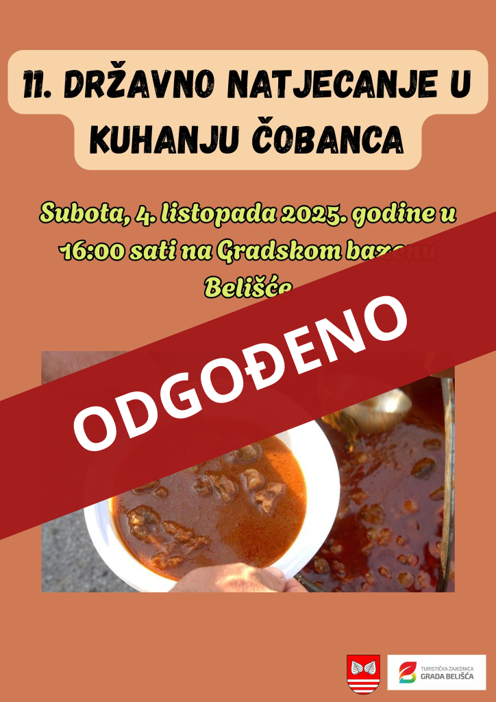Temeljem preporuka Nacionalnog kriznog stožera za kontrolu i suzbijanje afričke svinjske kuge na području RH, a u svezi javnih okupljanja na područjima koja su u zoni zaštite, zoni nadziranja ili u neposrednoj blizini istih, obavještavamo javnost da se manifestacija „11. DRŽAVNO NATJECANJE U KUHANJU ČOBANCA“ u Belišću koja se trebala održati 4. 10. 2025. godine (SUBOTA), odgađa.