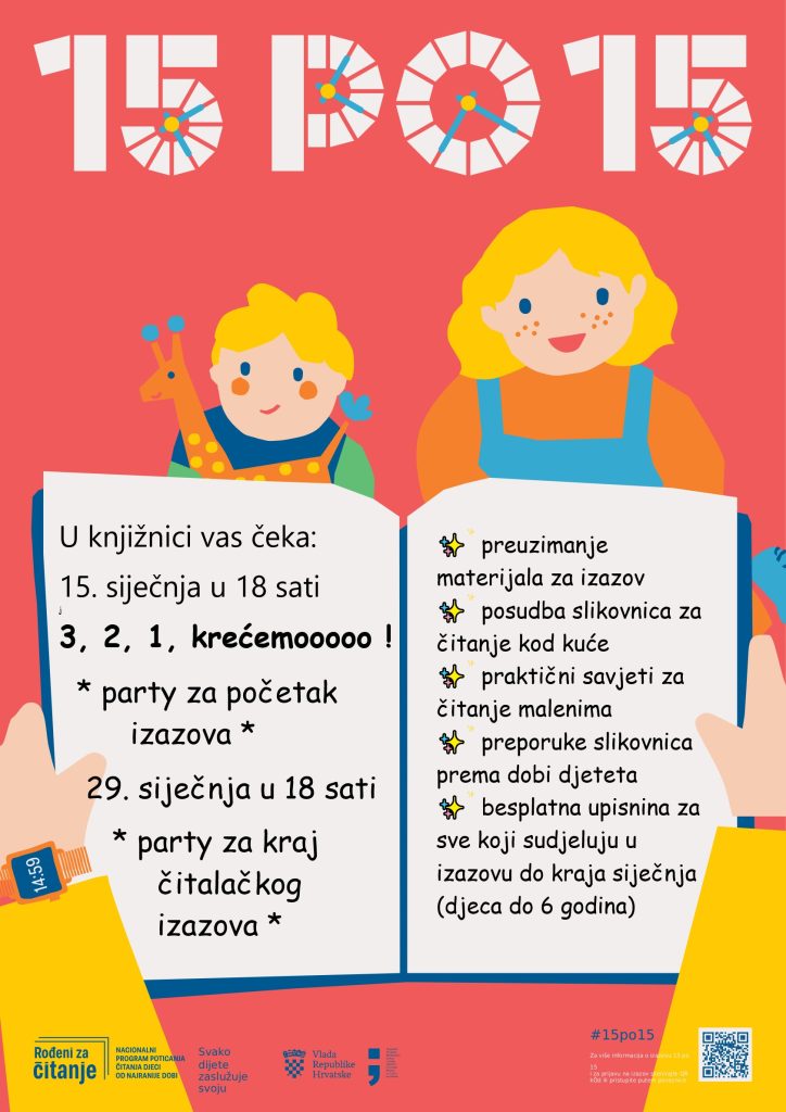 Pozivaju se roditelji i djeca na sudjelovanje u izazovu 15 po 15 – cijela Hrvatska čita djeci – na čitalački party za predškolce i roditelje povodom početka izazova!
