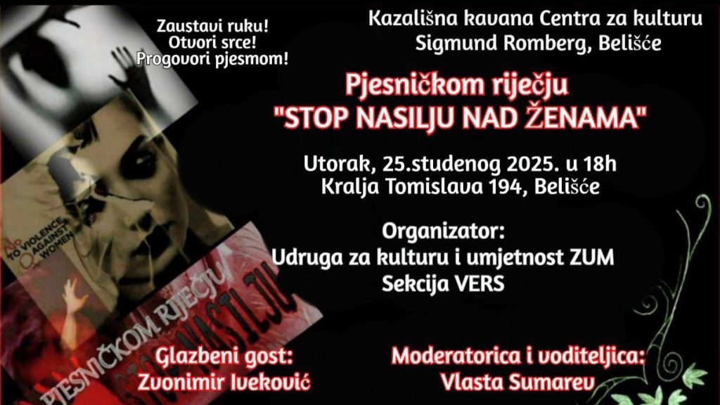 Udruga za kulturu ZUM i pjesnička sekcija Vers pozivaju građane na međunarodnu manifestaciju „Pjesničkom riječju STOP nasilju nad ženama“, koja će se održati u utorak, 25. studenoga, u 18 sati u Kazališnoj kavani Centra za kulturu Sigmund Romberg u Belišću.