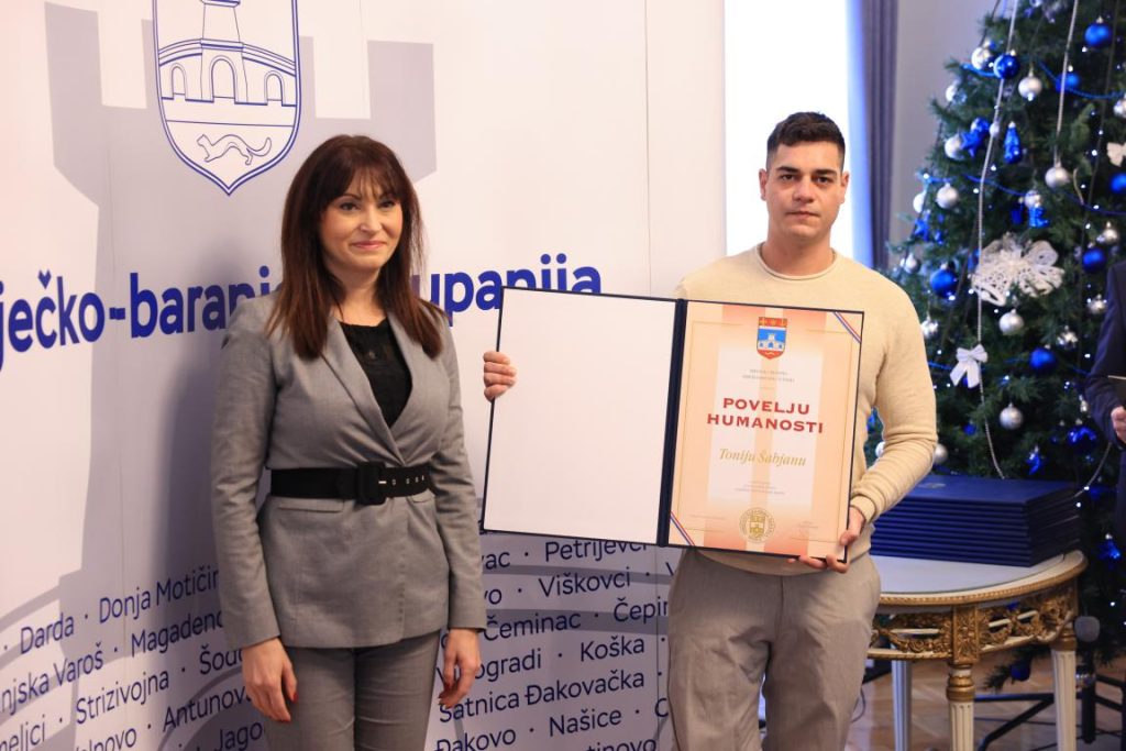 „Povelju humanosti Osječko-baranjske županije“, najviše županijsko javno priznanje za humana djela, danas (5. prosinca 2025. godine) županica Nataša Tramišak uručila je ovogodišnjim laureatima. To su Emanuel Horvatiček, Ivan Jozić i Toni Šabjan, svi iz Belišća, koji su uz vlastiti rizik i samopožrtvovanje 8. srpnja ove godine spasili dvije osobe od utapanja u Dravi kod Belišća, te 11 dobrovoljnih darivatelja krvi koji su više od 100 puta dali krv – Miroslav Mihić, Vesna Žarić, Ivan Malkoč, Hrvoje Barun, Dalibor Hocenski, Krešimir Ibrišimović, Ante Jović, Luka Novaković, Marko Pirić, Josip Hršak i Željko Gebaj.