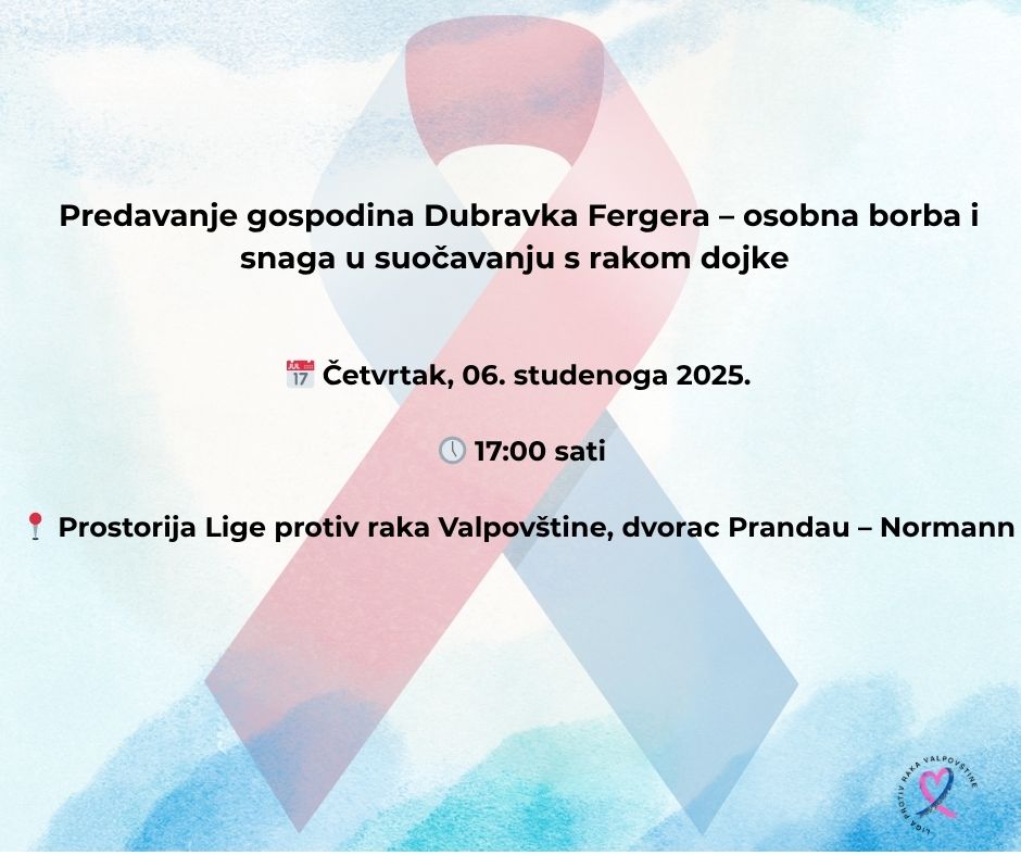 Liga protiv raka Valpovštine organizira posebno i poticajno predavanje pod nazivom „Osobna priča o borbi protiv raka dojke“, koje će održati gospodin Dubravko Ferger – muškarac koji je osobno prošao kroz iskustvo dijagnoze, liječenja i oporavka od ove bolesti.
