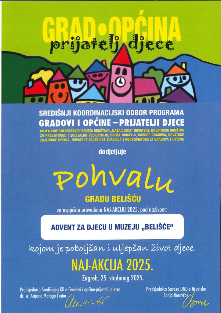 Na održanom Savjetovanju dodijeljene su i Povelje i Pohvale za Naj-akcije te je Gradu Belišću dodijeljena Pohvala za naj-akciju Advent za djecu u Muzeju „Belišće“.