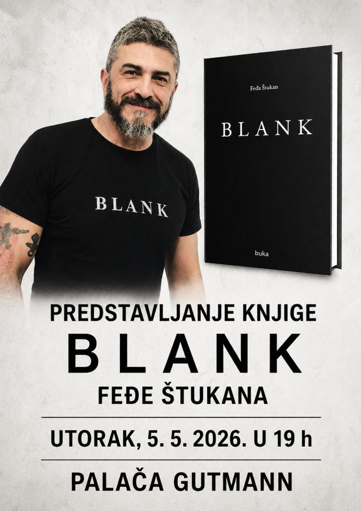 U Gradskoj knjižnici i čitaonici Belišće povodom obilježavanja Dana grada Belišća, u utorak 5. svibnja 2026. godine, u 19 sati započet će promocija knjige “Blank” autora Feđe Štukana. Osim što je autor regionalnog hita knjige „Blank“, Štukan je bosanskohercegovački kazališni, televizijski i filmski glumac, rođen u Sarajevu. Pored značajnih uloga u domaćim filmovima i serijama, ostvario je i međunarodnu karijeru.