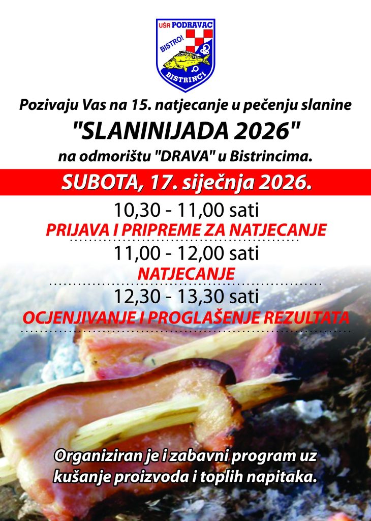 Udruga športskih ribolovaca Podravac Bistrinci poziva sve ljubitelje tradicije, dobre hrane i druženja na 15. Slaninijadu, popularno natjecanje u pečenju slanine koje će se održati u subotu, 17. siječnja, na odmorištu „Drava“ u Bistrincima.