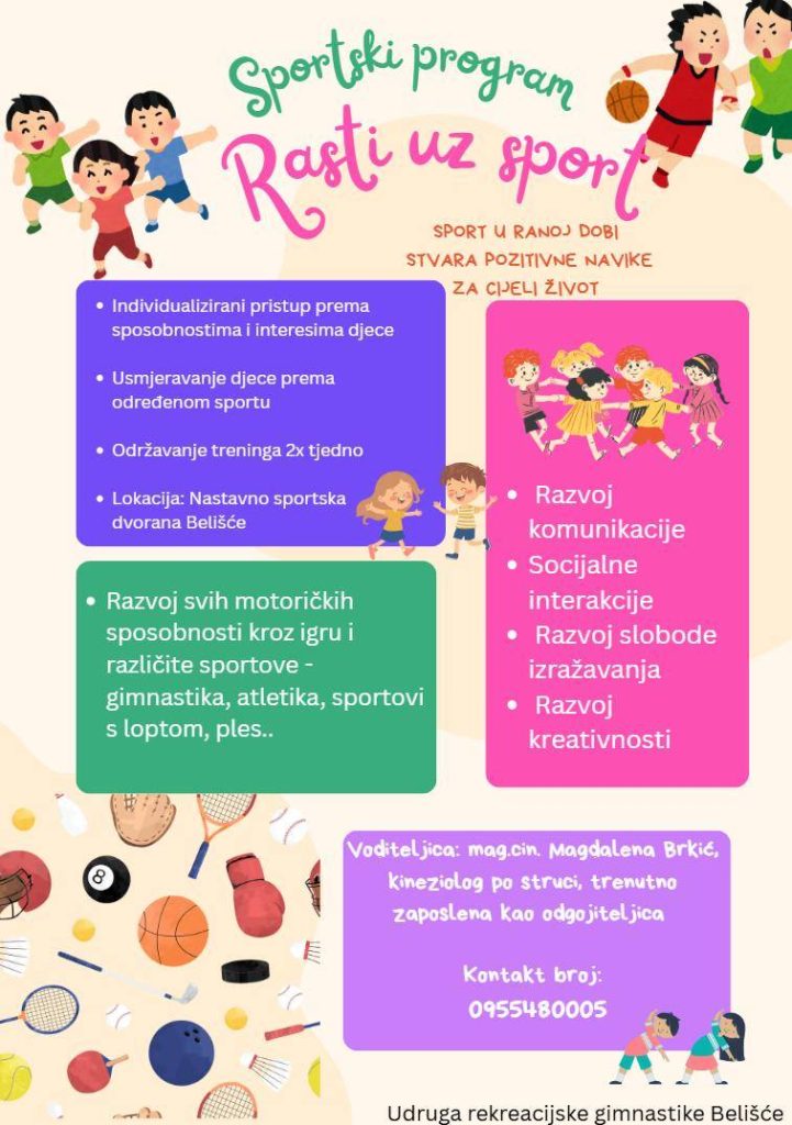 Udruga rekreacijske gimnastike Belišće pokreće sportski program “Rasti uz sport”, namijenjen djeci u dobi od 5 i 6 godina, s ciljem razvoja zdravih životnih navika od najranije dobi.