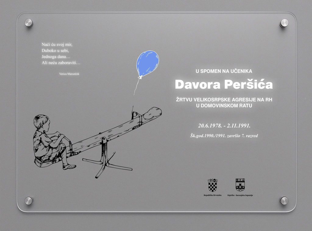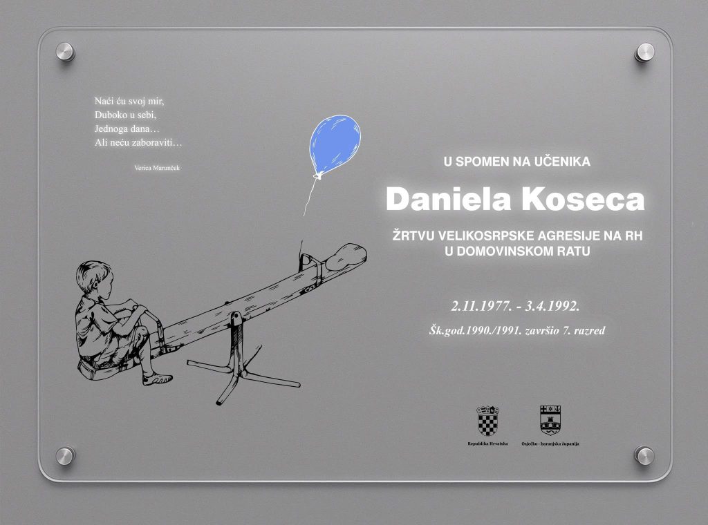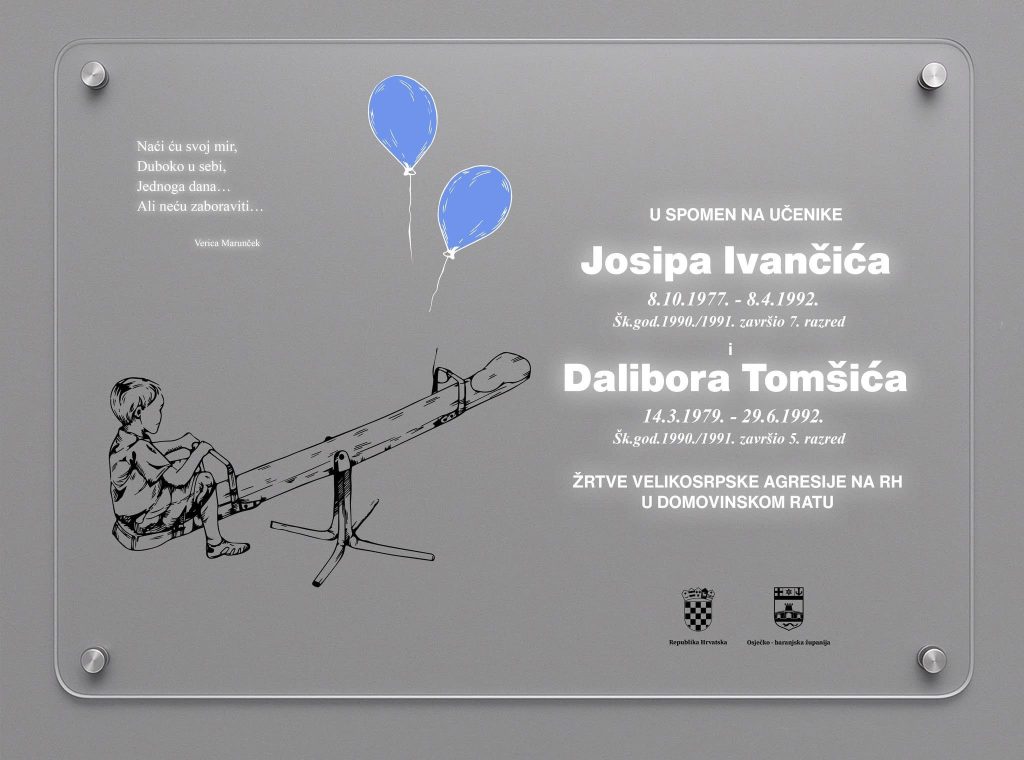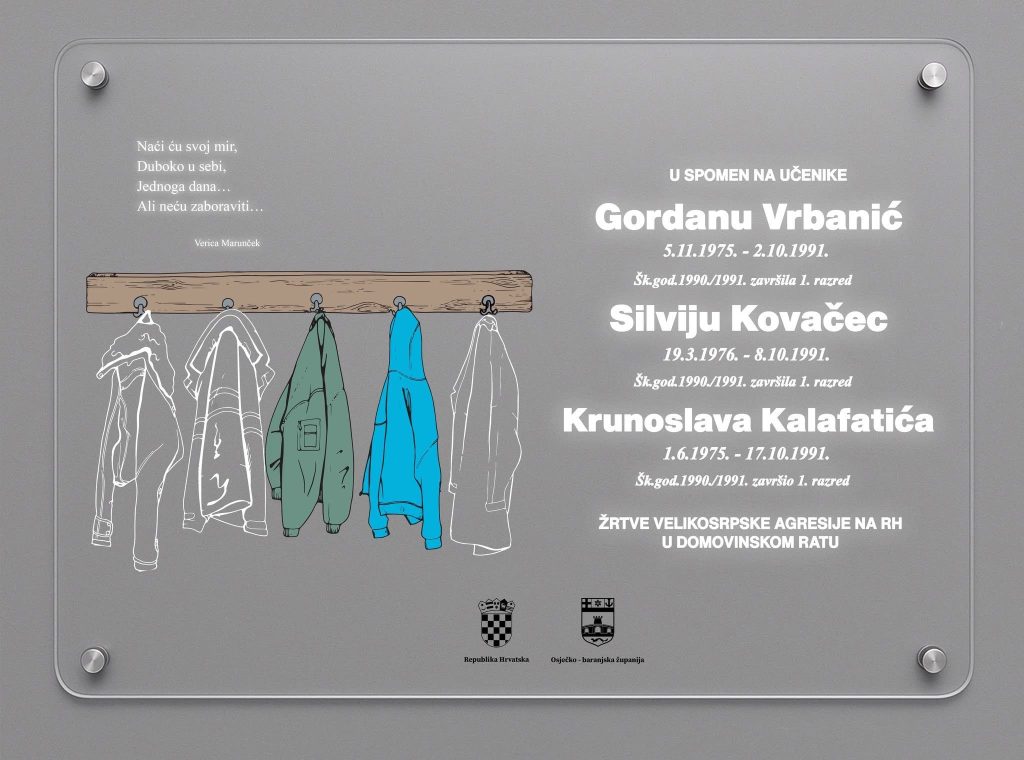 U osnovnim i srednjim školama diljem Osječko-baranjske županije postavljeno je 17 spomen-ploča u trajni spomen na 21 dijete koje je izgubilo život tijekom Domovinskog rata na području županije. Ploče su postavljene kako bi se sačuvala uspomena na djecu čije je djetinjstvo prekinuto ratom – na učenike čija su imena nekoć ispunjavala školske dnevnike i hodnike, a danas ostaju trajno upisana u povijest.